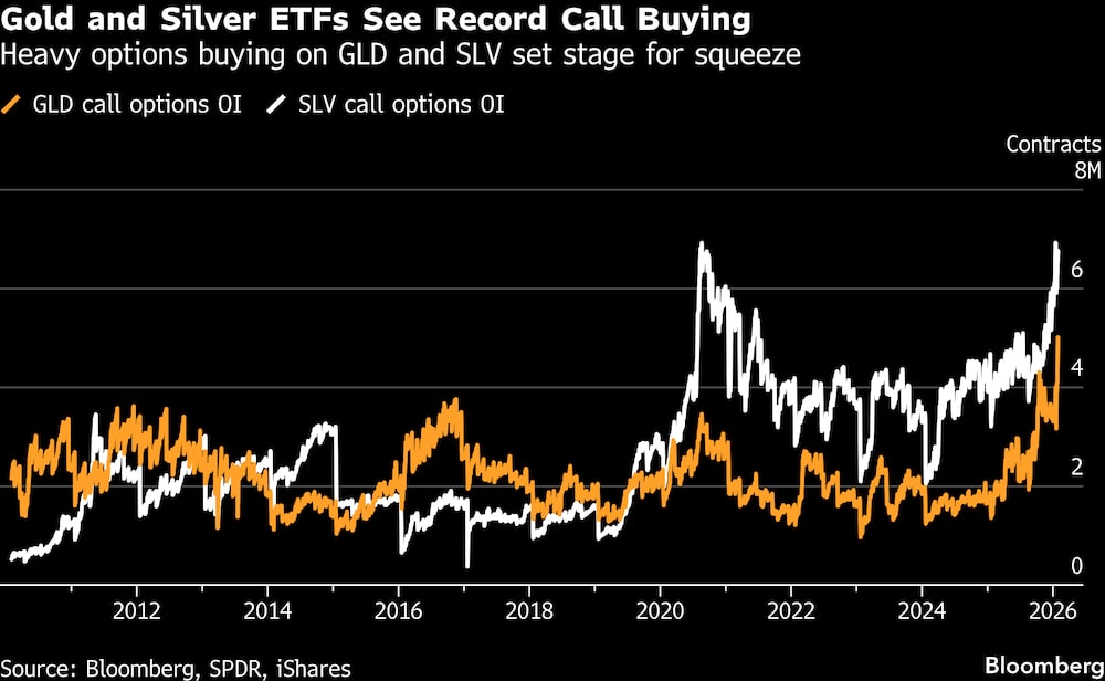 Os maiores ETFs de ouro e prata registraram, nas últimas semanas, níveis recordes de posições em aberto e volumes de negociação em opções de compra, e o volume de calls do SLV superou o do principal ETF que acompanha o índice Nasdaq 100 de ações de tecnologia.