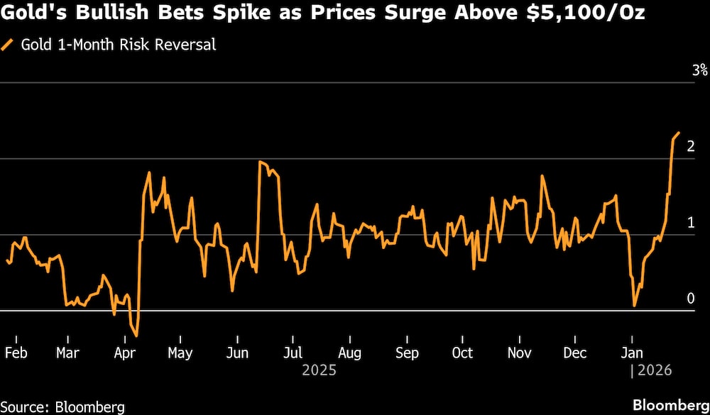 “Embora as reversões de risco geralmente fiquem positivas durante fortes ralis do ouro, o movimento atual se destaca pela magnitude e persistência”, disse Christopher Wong, estrategista do Oversea-Chinese Banking Corp. Isso indica que o mercado de opções “se posiciona para algo além de um salto de preços de curto prazo, em linha com o ouro incorporando um prêmio geopolítico e de confiança”, afirmou.