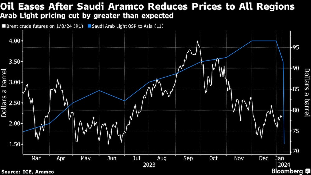 Bloomberg — O petróleo caiu depois que a Arábia Saudita reduziu os preços de venda oficiais para todas as regiões, enfatizando uma perspectiva cada vez pior e superando a preocupação com as tensões no Mar Vermelho e as interrupções no fornecimento na Líbia.