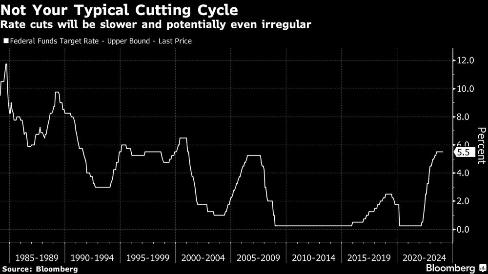 As taxas subiram em 2022 e 2023 no ritmo mais rápido em quatro décadas, à medida que o banco central americano buscava conter a inflação crescente. Agora, com as pressões inflacionárias diminuindo e a economia ainda forte, os diretores do Fed estão preparados para reduzir as taxas em um ritmo mais lento e potencialmente menos regular.