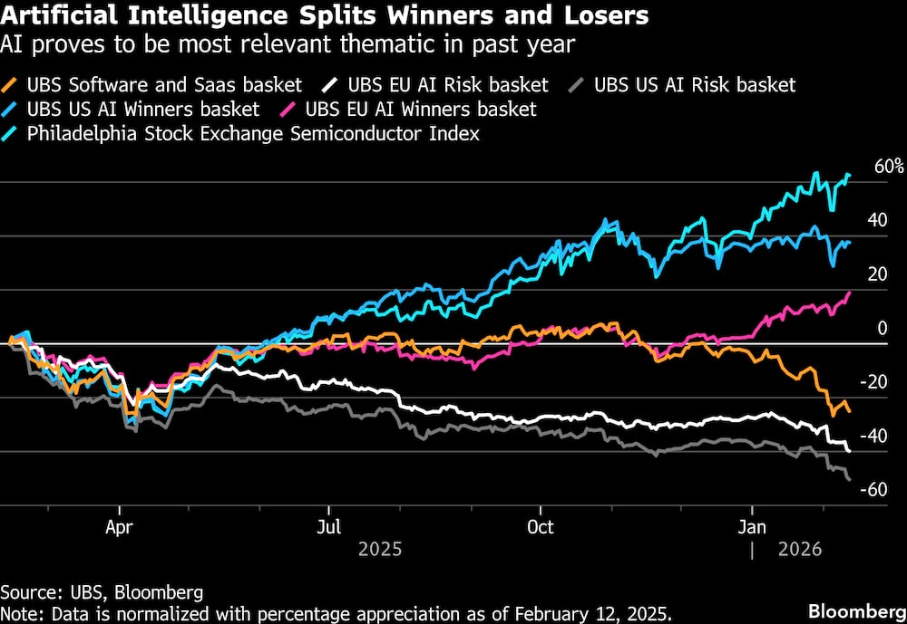 As cestas de ações com risco de IA compiladas pelo UBS despencaram de 40% a 50% no ano passado. Nos EUA, elas incluem a Salesforce, a Unity Software e a ServiceNow, enquanto na Europa, incluem a London Stock Exchange Group, a WPP, a Wolters Kluwer e a Capgemini.