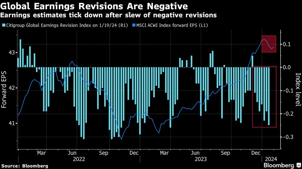 Os estrategistas do JPMorgan Chase (JPM) também adotaram um tom cauteloso em relação aos lucros, principalmente devido à fraqueza na região do euro. As estimativas de lucros das empresas do índice MSCI All-Country World têm se reduzido nas últimas semanas. Analistas têm constantemente revisado as estimativas para baixo.