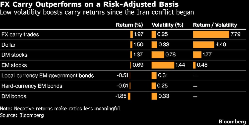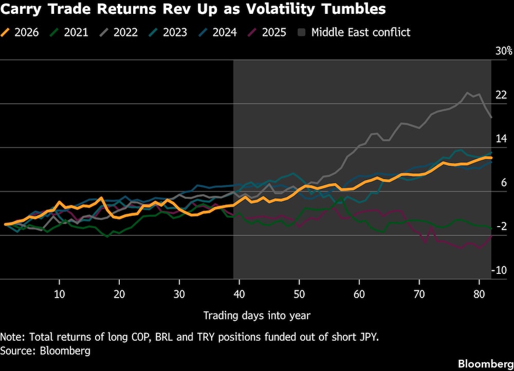 O carry trade — tomar emprestado em países onde os juros estão baixos e investir naqueles que oferecem taxas mais altas — já vinha prosperando enquanto a guerra provocava uma disparada nos preços do petróleo, fortalecendo moedas de commodities como o real e o peso colombiano.