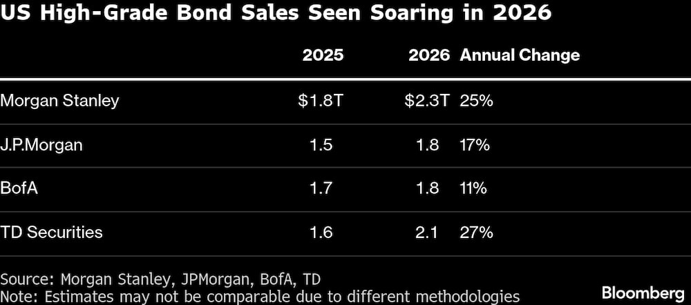 Estrategistas do Morgan Stanley preveem que mais de US$ 2 trilhões em dívida de grau de investimento nos EUA cheguem ao mercado no próximo ano, o maior volume já registrado.