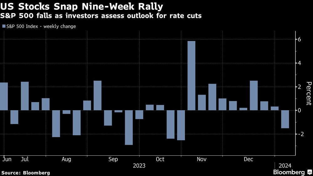 O S&P 500 começou 2024 em queda, interrompendo um rali de nove semanas à medida que os traders reduzem parte de seu otimismo em relação ao momento e à escala dos cortes nas taxas de juros dos EUA.