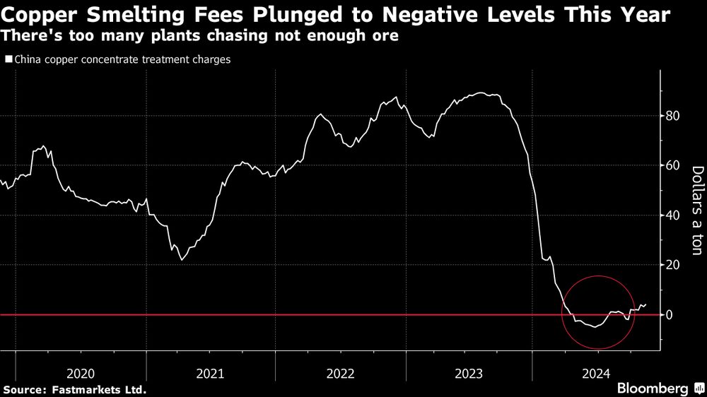 As taxas de refino pagas às fundições para converter o minério em metal podem cair para US$ 40 por tonelada ou menos no próximo ano, de acordo com estimativas do setor, em comparação com US$ 80 por tonelada em 2024.