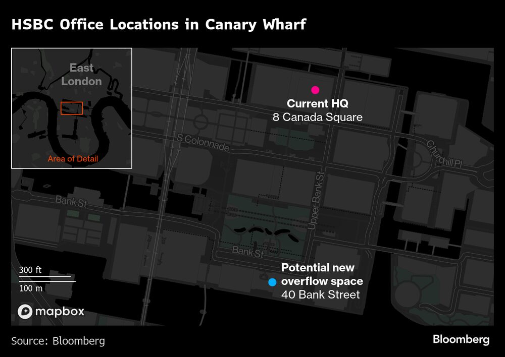 O HSBC, que, sob o comando do ex-diretor executivo Noel Quinn, pretendia reduzir sua área imobiliária em 40%, assinou um contrato para uma nova sede global na City de Londres no final de 2023, o que representou uma grande redução em relação à sua base atual em Canary Wharf.