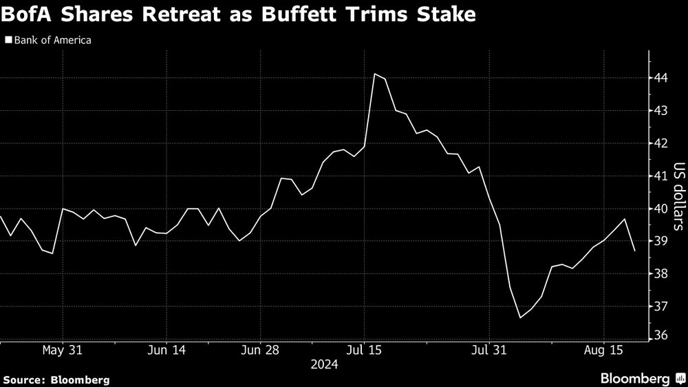 Bloomberg — O Bank of America (BAC) caiu na bolsa depois que a Berkshire Hathaway, de Warren Buffett, vendeu mais de US$ 550 milhões em ações, diminuindo ainda mais sua participação no banco de Wall Street.