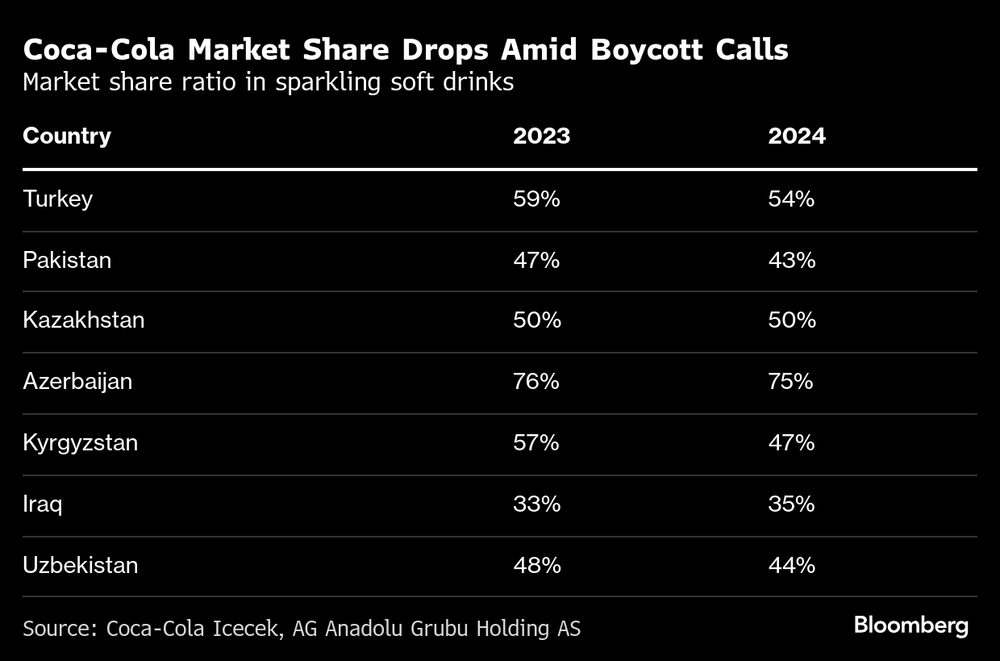 A participação da Coca-Cola Icecek, sediada em Istambul, no mercado turco caiu cinco pontos percentuais, para 54%, e sua participação no mercado de bebidas com gás do Paquistão caiu quatro pontos percentuais, de acordo com dados divulgados no mês passado pela empresa. Também foram registradas quedas no Quirguistão, Jordânia e Uzbequistão.