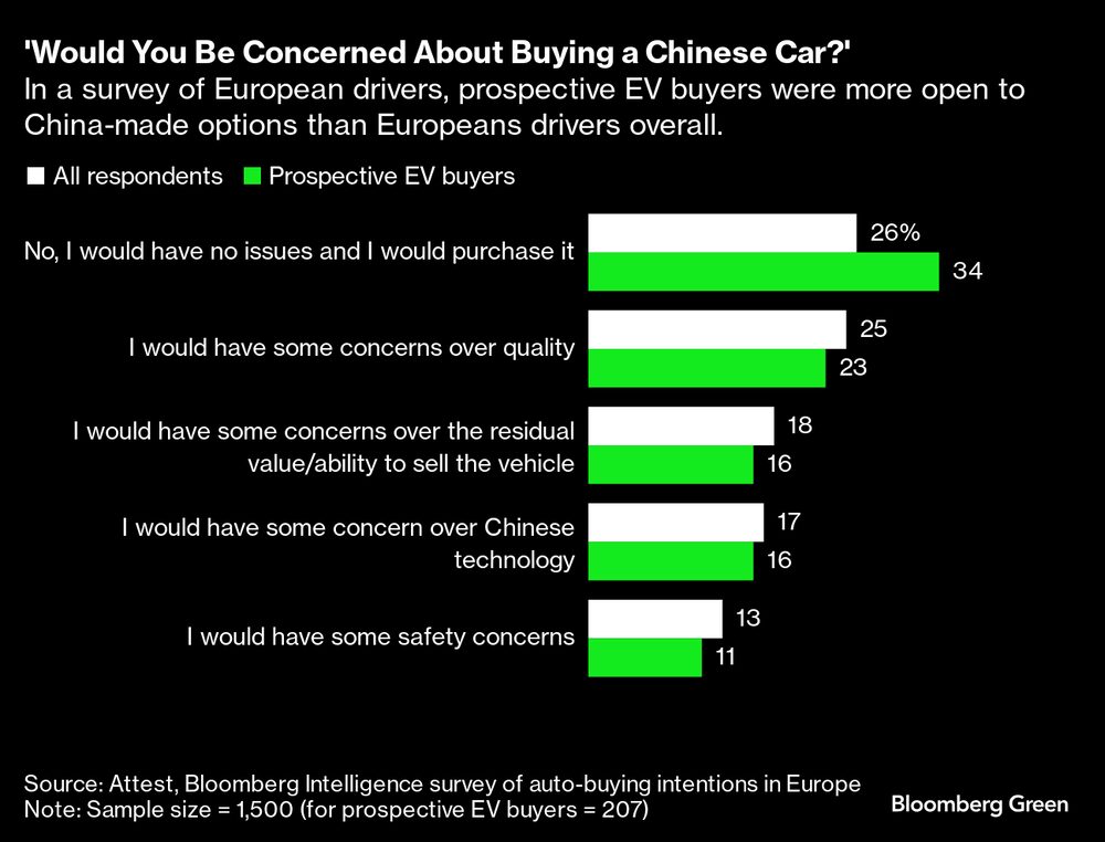 Cerca de 74% dos entrevistados em uma pesquisa recente da Bloomberg Intelligence expressaram preocupação em comprar um carro de marca chinesa, citando a qualidade (25%), a segurança (14%) e a tecnologia chinesa (17%) como principais fatores.