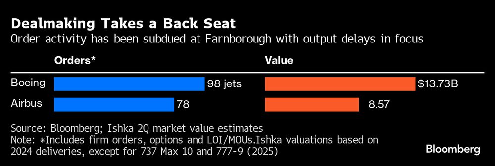 As novas encomendas têm sido moderada em Farnborough após o frenesi de negócios pós-covid do ano passado. As carteiras de pedidos para as famílias mais vendidas, do Airbus A320neo e do 737 Max da Boeing, agora se estendem por quase dez anos no ritmo de produção atual, estimou George Ferguson, da Bloomberg Intelligence.
