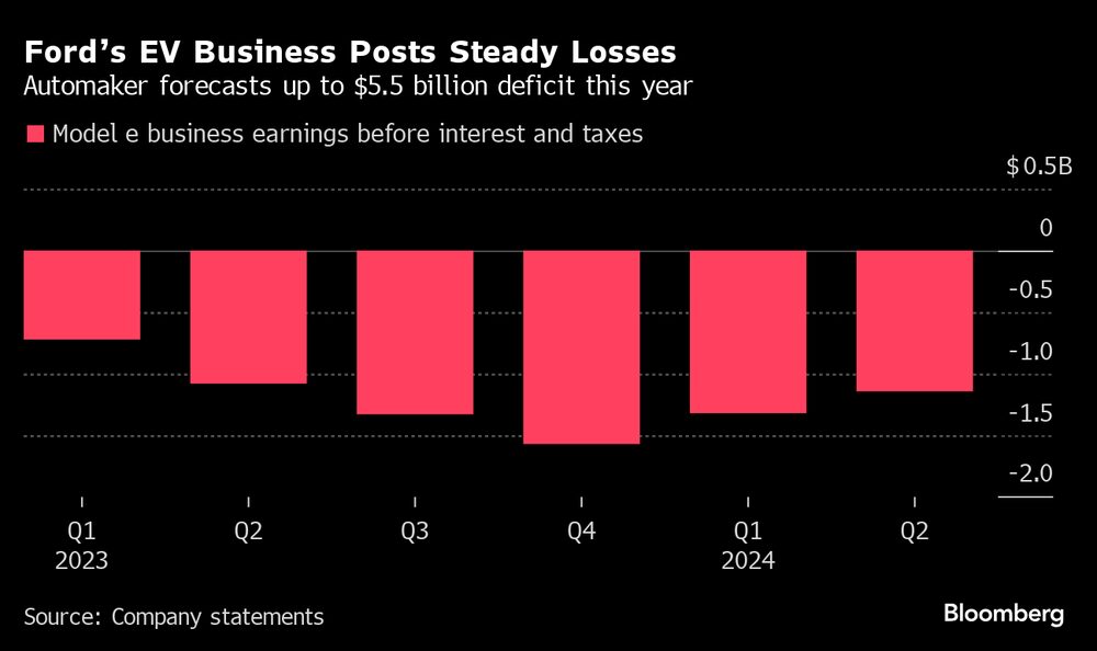 A montadora incorreu em custos significativos para aumentar a produção quando o crescimento das vendas do setor começou a diminuir, levando a Ford a prever que sua unidade de veículos elétricos perderá até US$ 5,5 bilhões este ano.