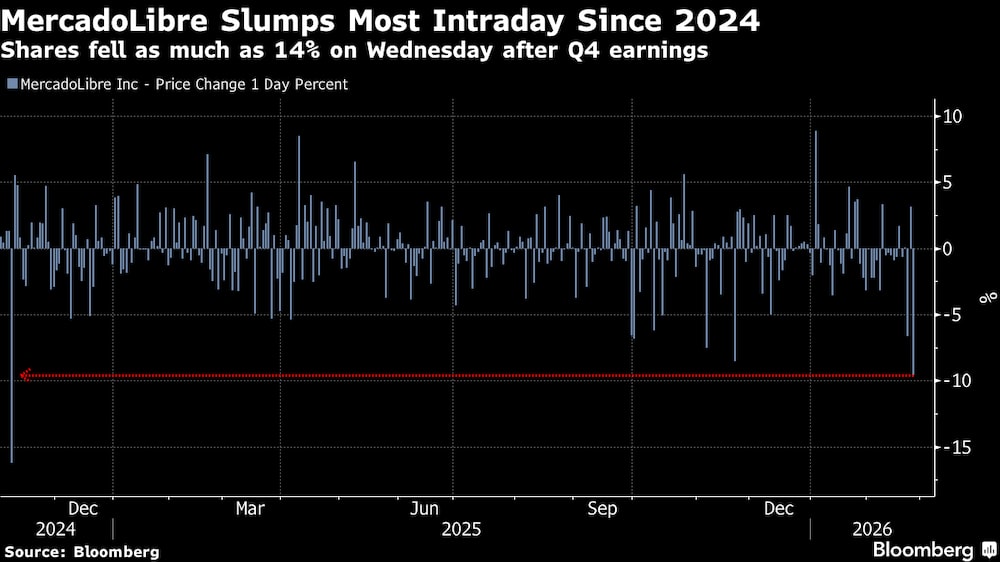 Bloomberg — As ações da Mercado Livre registraram a maior queda intradiária desde 2024 após o lucro líquido do quarto trimestre ficar abaixo das estimativas de analistas, refletindo o ritmo elevado de investimentos nas principais frentes de negócio.