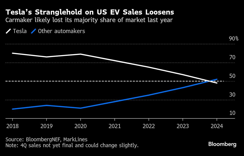 As marcas que acumularam participação de mercado às custas da Tesla variaram de acordo com o mercado. Na Califórnia, a Honda e a Hyundai ganharam a maior parte do mercado de veículos elétricos do estado no ano passado.