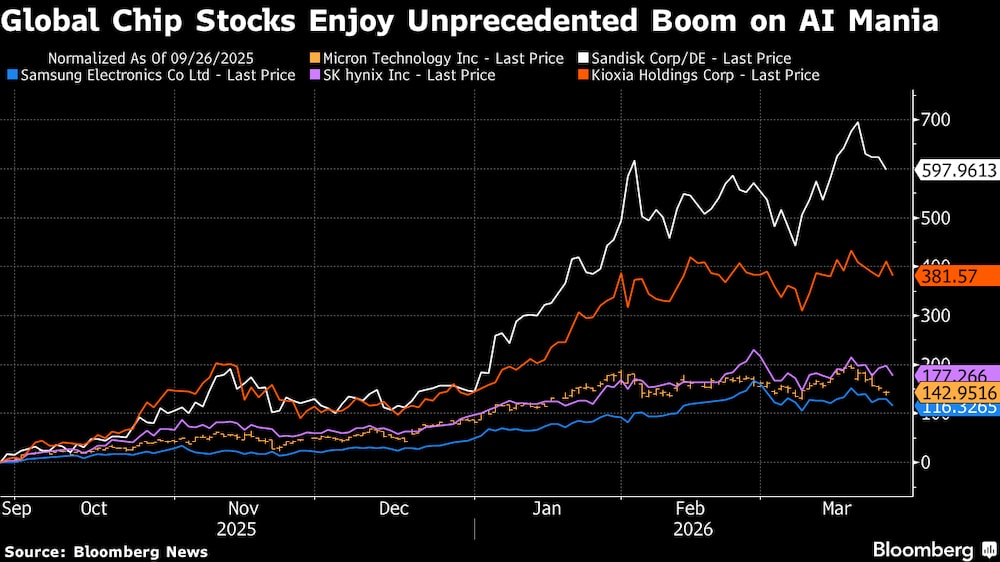 As ações da Sandisk ainda acumulam alta de mais de 1.000% desde o final de agosto, enquanto as da Kioxia subiram mais de 600%. Elas ultrapassaram as da Samsung, SK Hynix e Micron Technology, líderes tradicionais do setor de memória que se tornaram as queridinhas do mercado de IA.