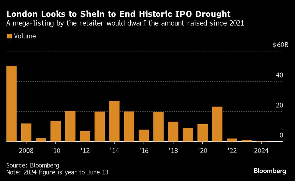 Bloomberg — Os banqueiros de Londres esperaram mais de dois anos para que as ofertas públicas iniciais (IPOs, na sigla em inglês) se recuperassem. Quando surgiram as notícias de que a gigante chinesa do e-commerce Shein poderia ser listada pela primeira vez, com uma avaliação potencial de 50 bilhões de libras (US$ 64 bilhões), a cidade viu um negócio que poderia finalmente reverter a crise na área.