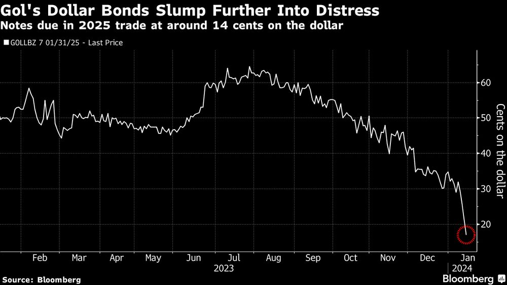 As notas da Gol, no entanto, caíram para níveis que refletem profunda angústia. A Lucror Analytics estima que o valor de recuperação para notas de dólar não garantidas com vencimento em 2025 está entre 15% e 20% - aproximadamente o mesmo nível atual.