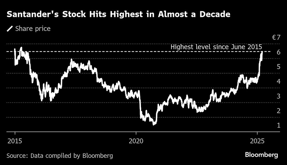 As ações do Santander subiram até 2,1%, atingindo o nível mais alto em quase uma década.