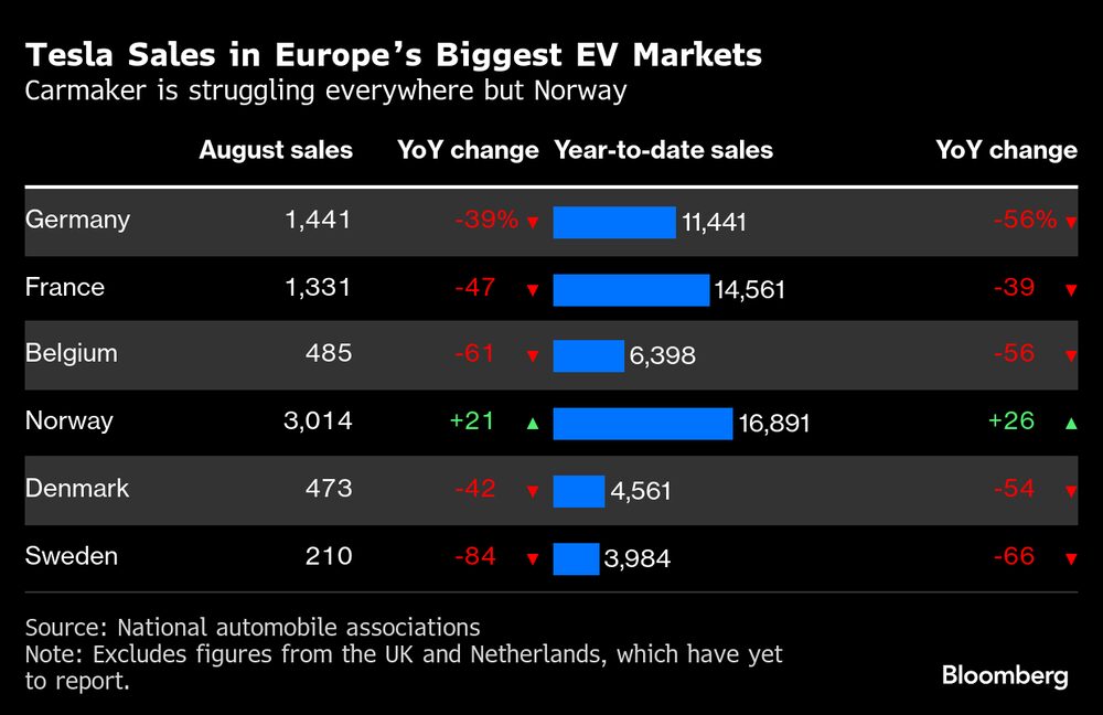 A montadora liderada por Elon Musk também registrou quedas acentuadas nas vendas de agosto na França, Bélgica, Dinamarca e Suécia.