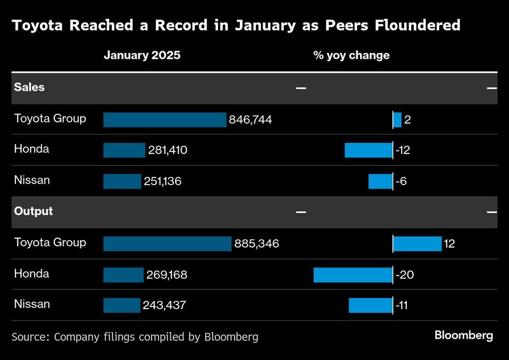 Em janeiro, as vendas do grupo Toyota no Japão cresceram 26%, enquanto as vendas de carros das marcas Toyota e Lexus aumentaram 13%. Na China, o maior mercado automobilístico do mundo, as vendas das duas marcas caíram 14%, já que os fabricantes de veículos elétricos, liderados pela BYD.