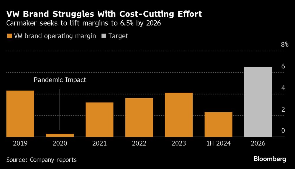 O principal alvo da VW é sua marca homônima de carros de passeio de baixo desempenho, cujas margens de lucro têm sido espremidas em meio a uma transição para veículos elétricos e uma desaceleração dos gastos do consumidor.
