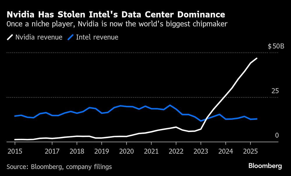A empresa que deu nome ao Vale do Silício dominou a computação, de laptops a data centers, com seus microprocessadores. Mas ela demorou a lançar o tipo de chip acelerador que a Nvidia oferece e não conseguiu conquistar uma participação de mercado significativa nessa área.
