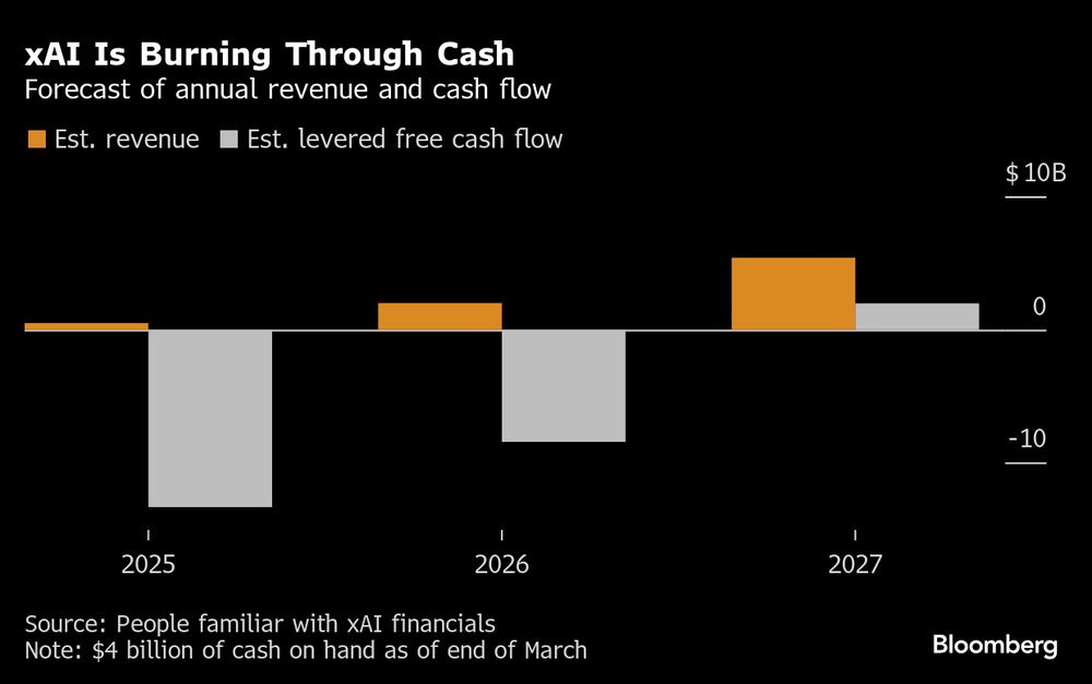 Na xAI, investidores foram informados recentemente que as receitas devem ser de apenas US$ 500 milhões este ano, subindo para mais de US$ 2 bilhões no ano que vem.